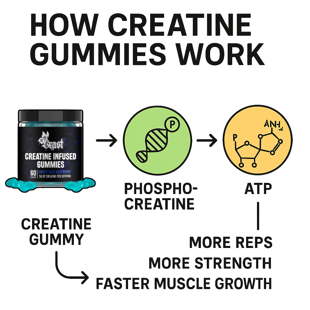 Creatine Gummies increases phosphocreatine levels, which helps regenerate ATP—the fuel your muscles need for intense workouts. This means more strength, more reps, and faster muscle growth.