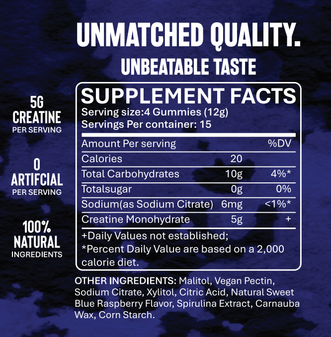 Our Creatine Infused Gummies have a Sweet Blue Raspberry taste with a hint of Hibiscus, similar to delicious fruity gummy candies!