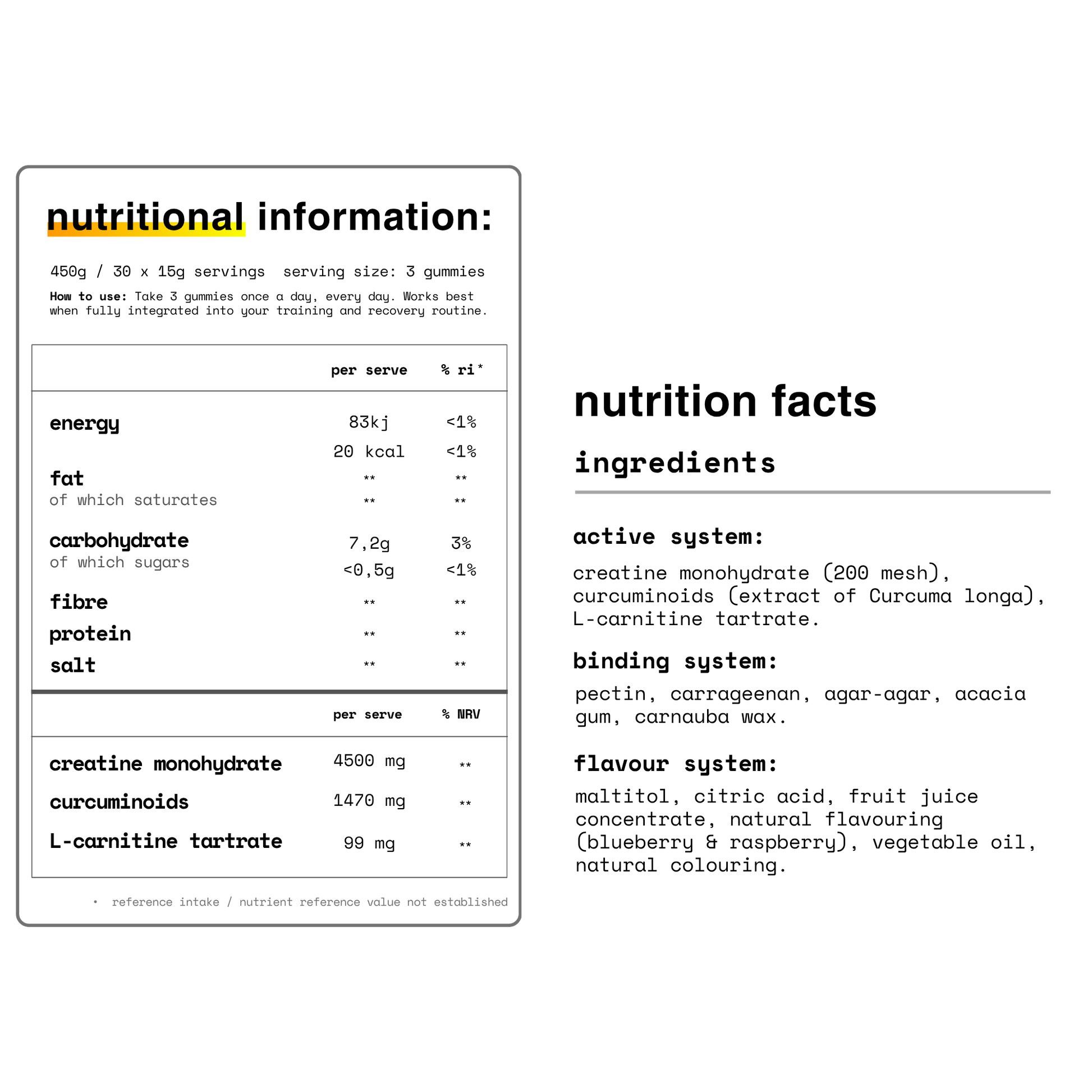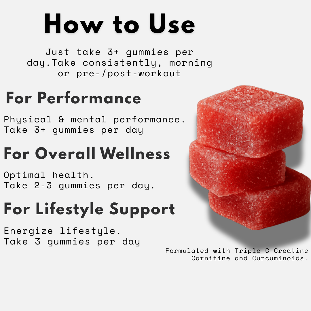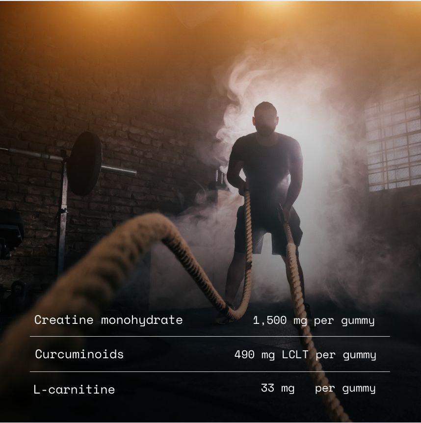 Each gummy delivers 1,500 mg Creatine, 490 mg Curcuminoids, and 33 mg L-Carnitine.